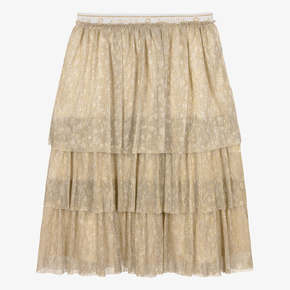 Gorgeous gold special occasion skirt for teen girls by AIGNER, with a cascading, tiered style. Lovely for a party, it has a jacquard gold and ivory waistband with a pretty shimmer. Lined in cotton for comfort, this midi skirt has a beautiful shimmer and is made in super lightweight and floaty plissé fabric.