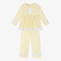 In a lovely shade of peach pink, these long pyjamas for girls are by Beau KiD. The top has pretty ruffle trims, with beautiful broderie anglaise detailing, and satin ribbon bows. Both pieces are made in soft and comfortable jersey, with a gently elasticated waist on the trousers.