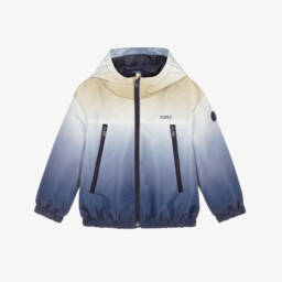 A lovely pale blue and white striped windbreaker jacket for little boys by BOSS. Smooth and lightweight, this hooded jacket has a zip fastening and protective chin guard on the front. Lined in soft mesh, it has discreet pockets and elasticated cuffs and hem for extra comfort. There is a bold blue logo printed on the chest and a striped trim on the back of the neck for a signature finish.