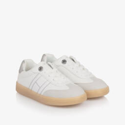 Exclusive to Childrensalon, a pair of smart white leather loafers for boys and girls by Children's Classics. Ideal for special occasions, this slip-on style is lined in soft leather with cushioned leather insoles and sleek rubber outsoles. Gold metal horse-bit details across the foot complete this stylish look.