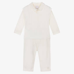 A pale blue top and grey trouser set for baby boys by British brand Emile et Rose. Soft and comfortable, both pieces are made in stretchy cotton jersey. The long-sleeved T-shirt has cute teddy bears embroidered around the ribbed neckline and it fastens easily with poppers on the back. The trousers have a gently elasticated waist for comfort, with the brand's adorable embroidered logo on one leg.