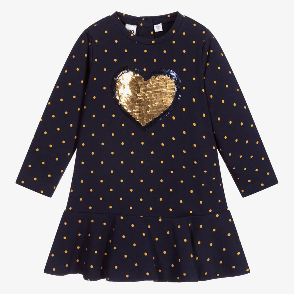 Girls navy blue and yellow polka dot dress by iDO Baby, made in soft cotton jersey. It has a fun reversible sequin heart design that changes from gold to silver with the brush of a hand. The dress has a lovely flippy hem and fastens with buttons on the back.