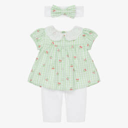 A fun pink leggings set for baby girls by Kissy Kissy, made in soft and stretchy Pima cotton jersey. The long-sleeved top has a girly castle in the clouds print with dainty love hearts and cute rainbows. It has sweet puff sleeves and ruffle trims on the cuffs and hem. There are popper fastenings on the back and a delicate picot trim on the neckline. The matching leggings come in plain pink and have an elasticated waist for added comfort.
