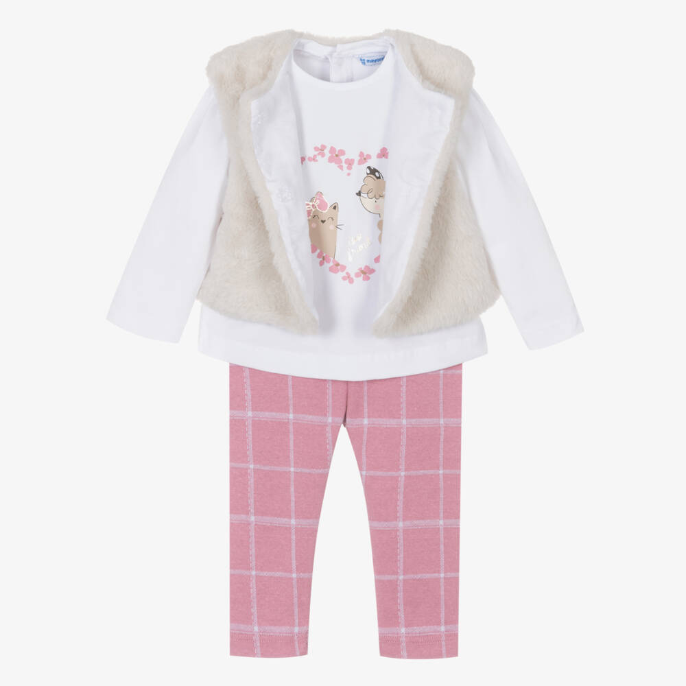 Sweet ivory and pink leggings set for little girls by Mayoral. The soft cotton jersey long-sleeved top has an adorable 'best friend' print of a cat and dog on the front. It fastens with poppers on the back for fuss-free dressing. The stretchy pink leggings have an elasticated waist for a comfortable fit and are patterned with a simple check. To complete the look, it has a beige faux fur gilet which has concealed popper fastenings for a neat finish.