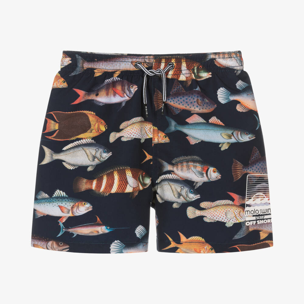 Navy blue swim shorts for teen boys, by Molo, made from recycled material with a sun protective rating of UPF 50+. Ideal for swimming, they have a soft mesh lining and a black rubberised logo badge on the back. They are finished in a bold and colourful fish print with a white surf-themed logo on the leg. They have an elasticated waist with drawstring ties for comfortable wear.