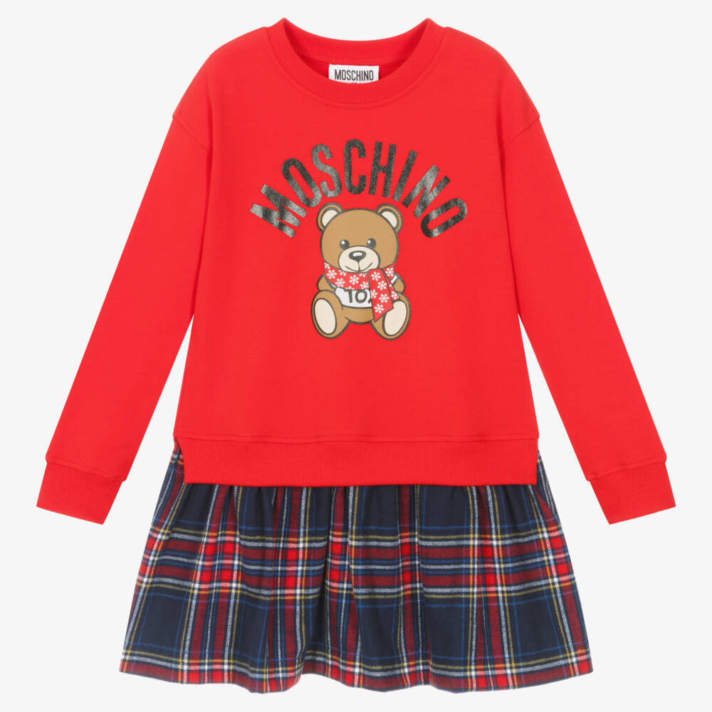 A red and navy blue cotton dress for girls from Moschino Kid-Teen, with a cool double-layered look. Made in super-soft sweatshirt jersey, the upper half has dropped shoulders, softly ribbed edges and the Italian label's Teddy Bear logo on the front, complete with a little red scarf for a festive feel. A stand-out black logo is printed above for extra designer appeal. In red, blue and yellow tartan, the skirt is made in flannel for cosy comfort.
