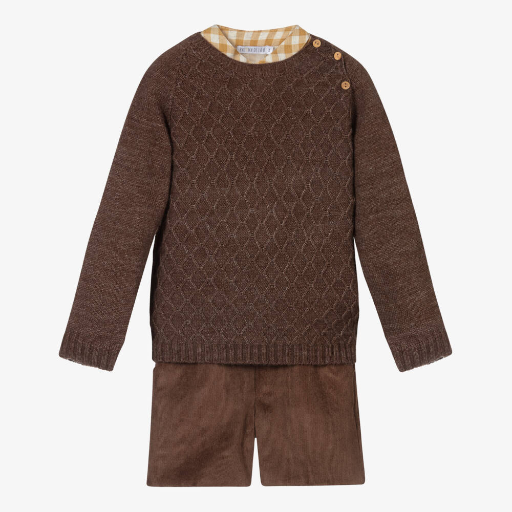 Boys three-piece shorts set from Paloma de la O. The mustard yellow and pale beige checked shirt is made in soft cotton twill, with front button fastening. The brown corduroy shorts are fully lined and have front pockets and an elasticated waistband. The brown sweater is knitted in a lightweight acrylic, with a diamond-shaped pattern and buttons on the shoulder.