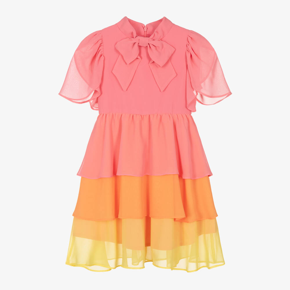 Lovely pink chiffon dress for girls by classic Portuguese brand Patachou, exclusive to Childrensalon and just right for a special event. It has a stand-up collar, beautiful tulip sleeves and a full, gathered skirt with pink, orange and yellow tiers. It is fully lined in pink voile for comfort and has a neat, concealed zip fastening on the back.