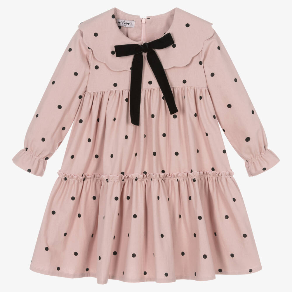 A pink cotton dress for girls by Portuguese brand Phi Clothing, patterned with black polka dots. Charming yet classic, this dress has a scalloped collar with a velvet bow trim on the front and frilly elasticated sleeves. There is a concealed zip fastening on the back.