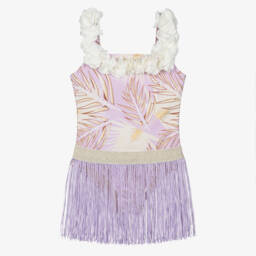Cute pink swim set for girls by Soli Swim. Made in a smooth recycled fabric, the top has a high neck and covers the shoulders, with UPF50+ for added protection. It is patterned with adorable unicorns, with rainbow ruffled trims on the sides. The shorts are patterned in a matching pastel stripe design and have a stretchy waistband for comfortable wear.