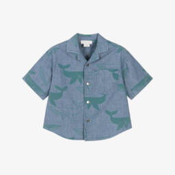 Charming blue shirt for girls by British designer Stella McCartney Kids, made in super soft, organic cotton denim. The collar, front patch pockets and cuffs all have colourful blanket stitching, whilst on the back is a gorgeous appliqué flower, with a happy, embroidered face. The shirt fastens with silver logo poppers on the front and cuffs. The Stella McCartney fit can be quite small, so choose a size up if you want room to grow.