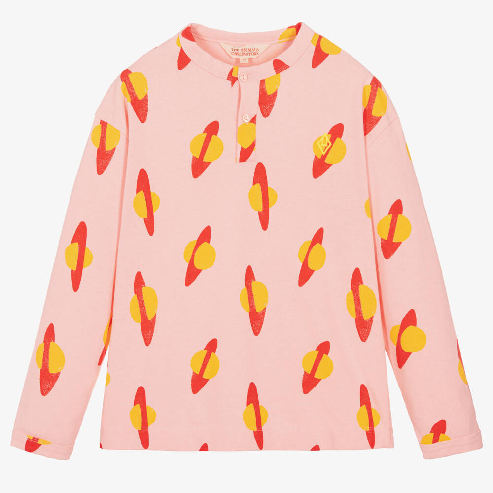 Cool and casual, a pink cotton top for teen boys and girls by The Animals Observatory, with an eye-catching planet print in red and yellow. Just right for relaxed days, it is made in comfortable jersey, with an embroidered yellow logo on one side and button fastenings on the front.