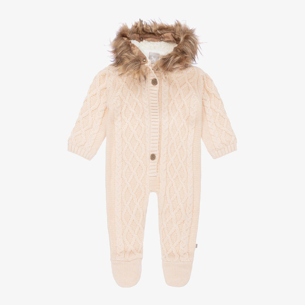 Blush pink hooded pramsuit for baby girls by The Little Tailor, knitted in soft cotton with a lovely cable pattern. The hood has a cosy plush lining to keep little ones warm and a removable faux fur trim. The body is lined in soft cotton jersey and it fastens with a zip and wooden buttons on the front.