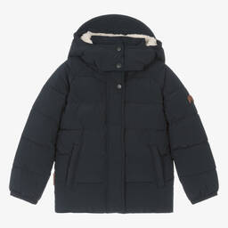 Navy blue puffer coat for boys and girls by British brand Töastie. Silky smooth and shower resistant, it is padded with recycled down to be lightweight whilst still providing superior warmth. Designed for a good fit, the hood is lined in soft cosy fleece and can easily be removed when not in use. To keep out chilly winds, the cuffs are elasticated and the concealed front zip fastening is covered by a popper fastening storm flap. There is an easy-grip zip puller, a subtle reflective safety detail, on the back and fleecy lined pockets to keep little hands warm.
