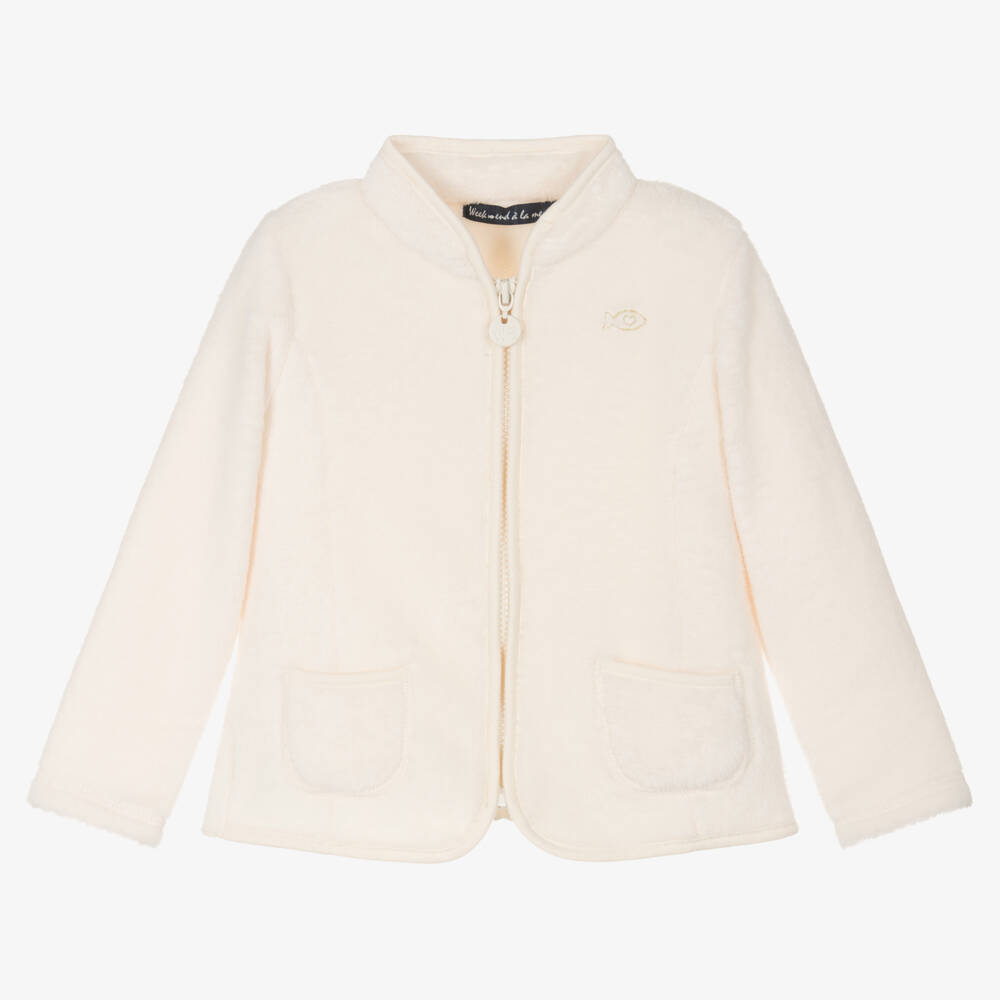 Ivory zip-up top for girls by French brand Week-end à la mer, made in super soft plush. Ideal as an extra layer on cooler days, it has glittery gold embroidered fish logos on the front and back. There is a zip fastening with a branded pull tab and little patch pockets.