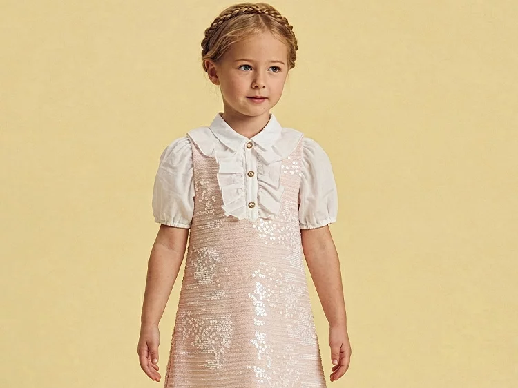 New SeasonBCBGMAXAZRIAGirls Pink Sequinned Tweed Dress with Ruffle Trim