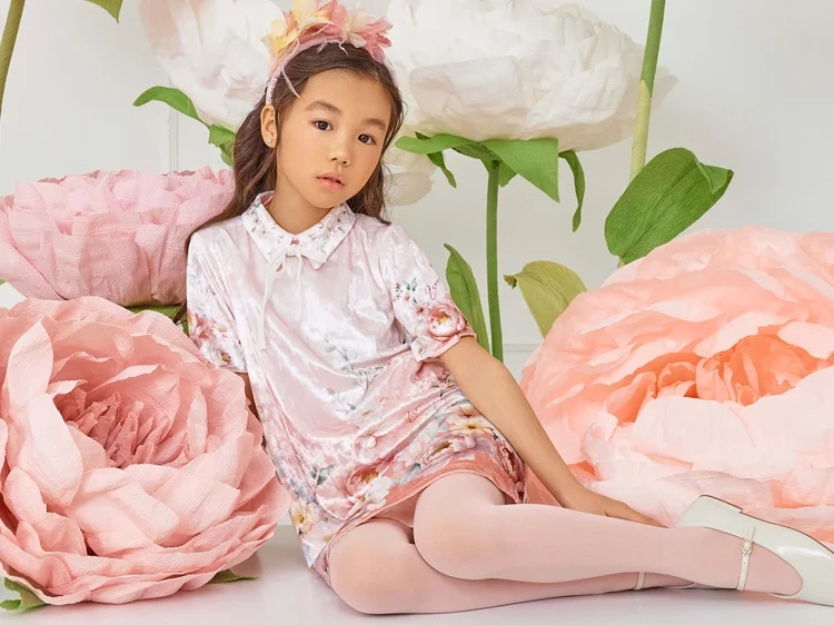 EIRENEGirls Pale Pink Velour Floral Print Dress