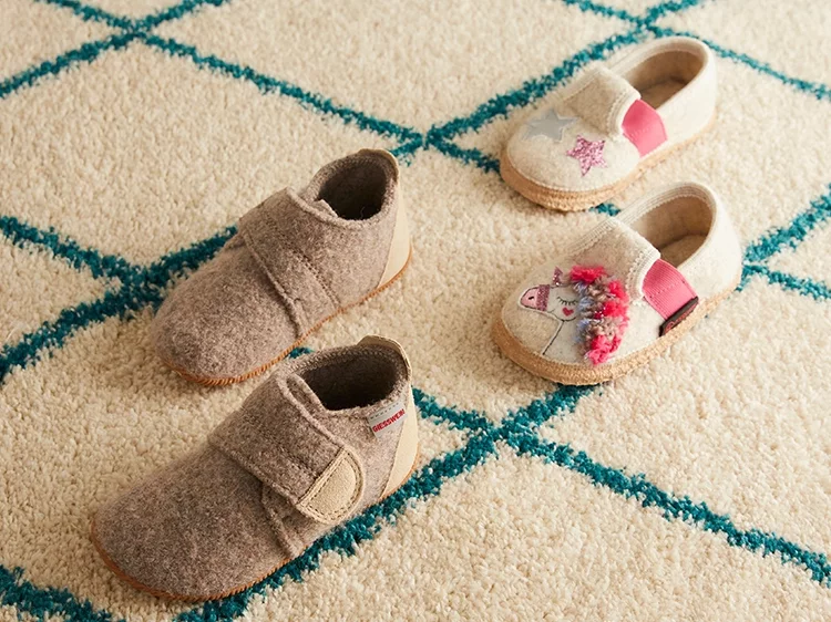 Step into a world of comfort. Family-run since 1954, Austrian footwear brand Giesswein makes wool its business. The collection for kids includes a range of snuggly slippers, traditionally crafted in cosy Merino wool to keep toes toasty around the house. Features also include non-slip soles and Velcro fastenings for ease.