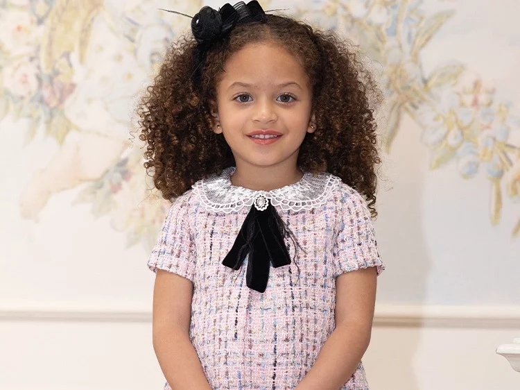 Piccola SperanzaGirls Pink Tweed Dress with Velvet Bow Brooch & Sequin Collar
