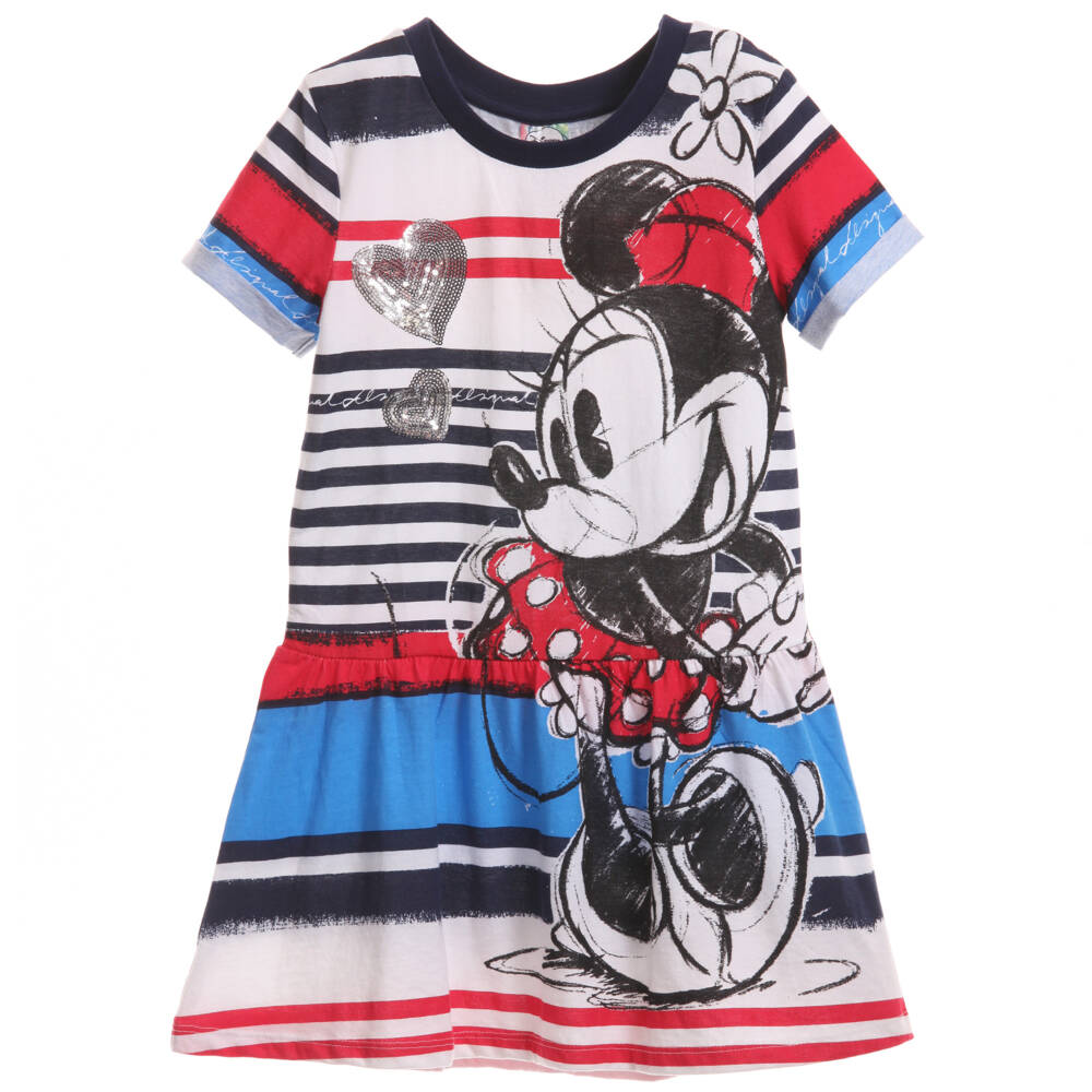 Girls cotton jersey, red and blue striped short sleeved, dress by Desigual with a cute Minnie Mouse image and silver sequinned hearts. Very comfortable to wear for party or play, it has a lightweight, loose fit.
