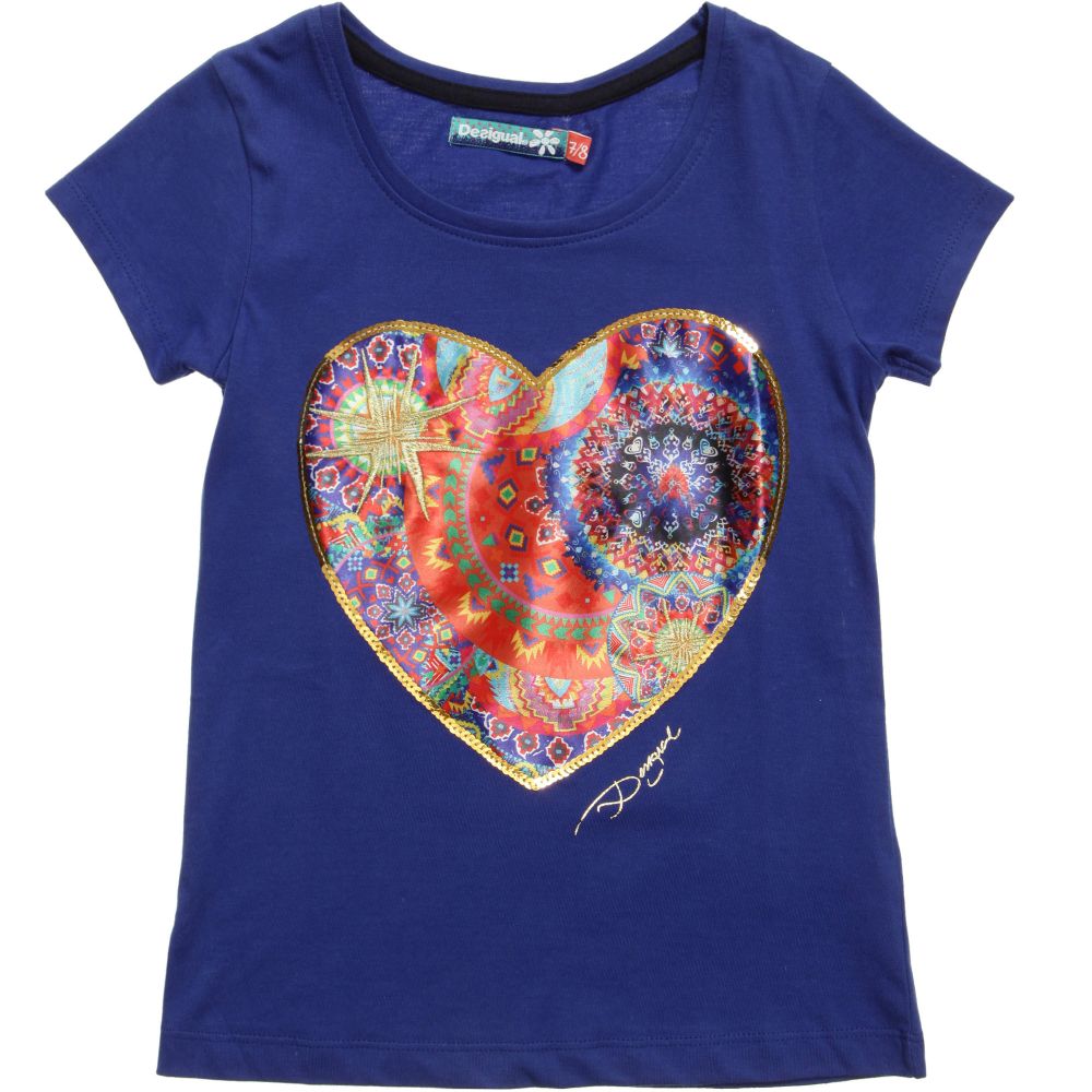 Girls cobalt blue T-shirt by Desigual with a bright satin appliqued heart on the front and pretty gold sequins.