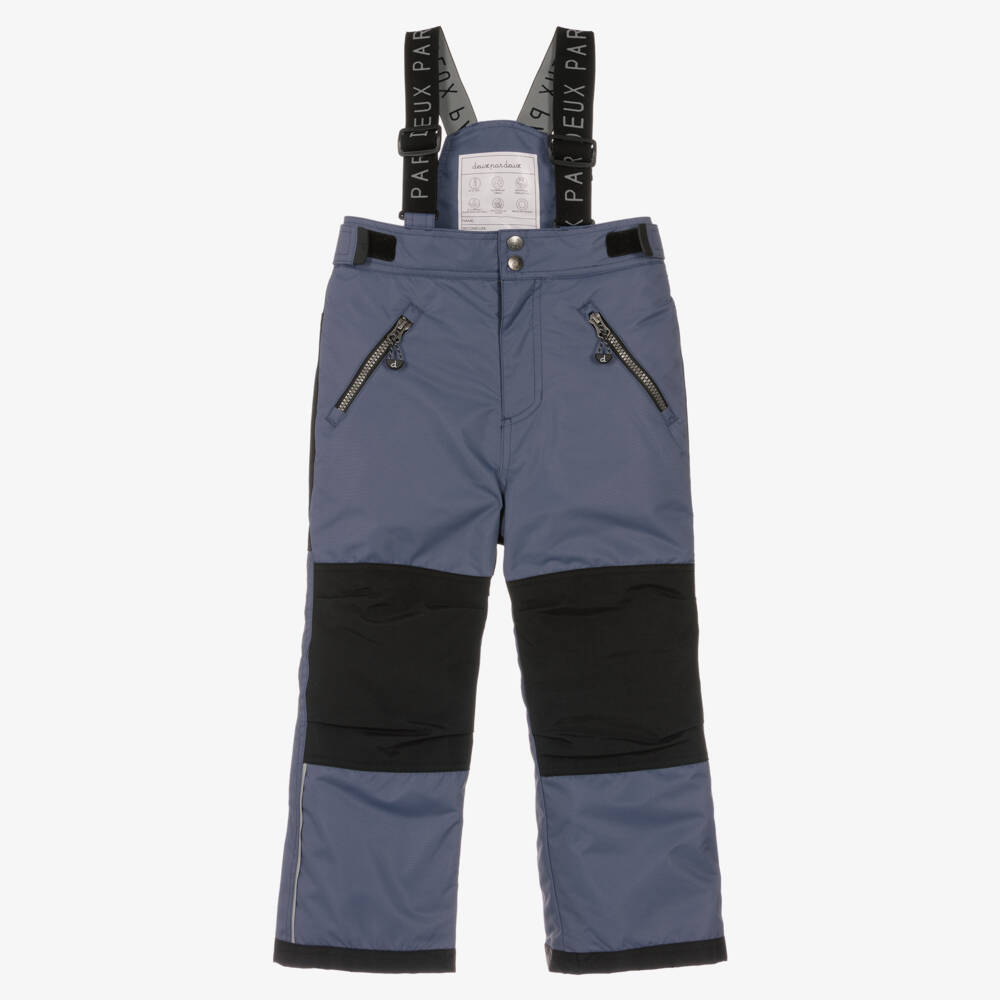 Mid-blue and black ski salopettes for boys and girls from Deux Par Deux, with removable and elasticated grey logo braces. Made in smooth and durable technical fabric, these TEFLON coated snowwear are breathable, waterproof and insulated against extreme cold weather. They feature a waistband with adjustable velcro straps on the sides, reinforced seat, knees and ankles, adjustable cuff length to grow with your child and inner gaiters to keep the snow out. There are two zipped pockets, a chunky front zip and poppers to fasten on the front and reflective trims for improved visibility.