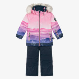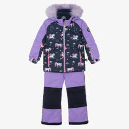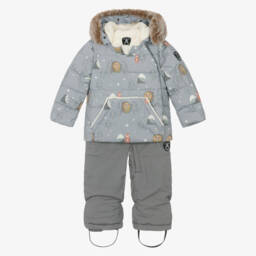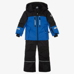 Boys blue and black two piece technical snowsuit by Deux par Deux, with reflective trims. Warmly padded and water-repellent, the zip-up jacket has a hood large enough to fit over a helmet, a soft, fleecy lining and inner elasticated shoulder straps. It has extendable sleeves, cuff inserts and an adjustable snow skirt for extra protection. Fastening with a zip and poppers, the adjustable-length trousers have removable braces, storm cuffs and reinforced panels on the seat, knee and cuffs. Both pieces have useful zipped pockets and taped seams. A cosy fleece snood completes the set.