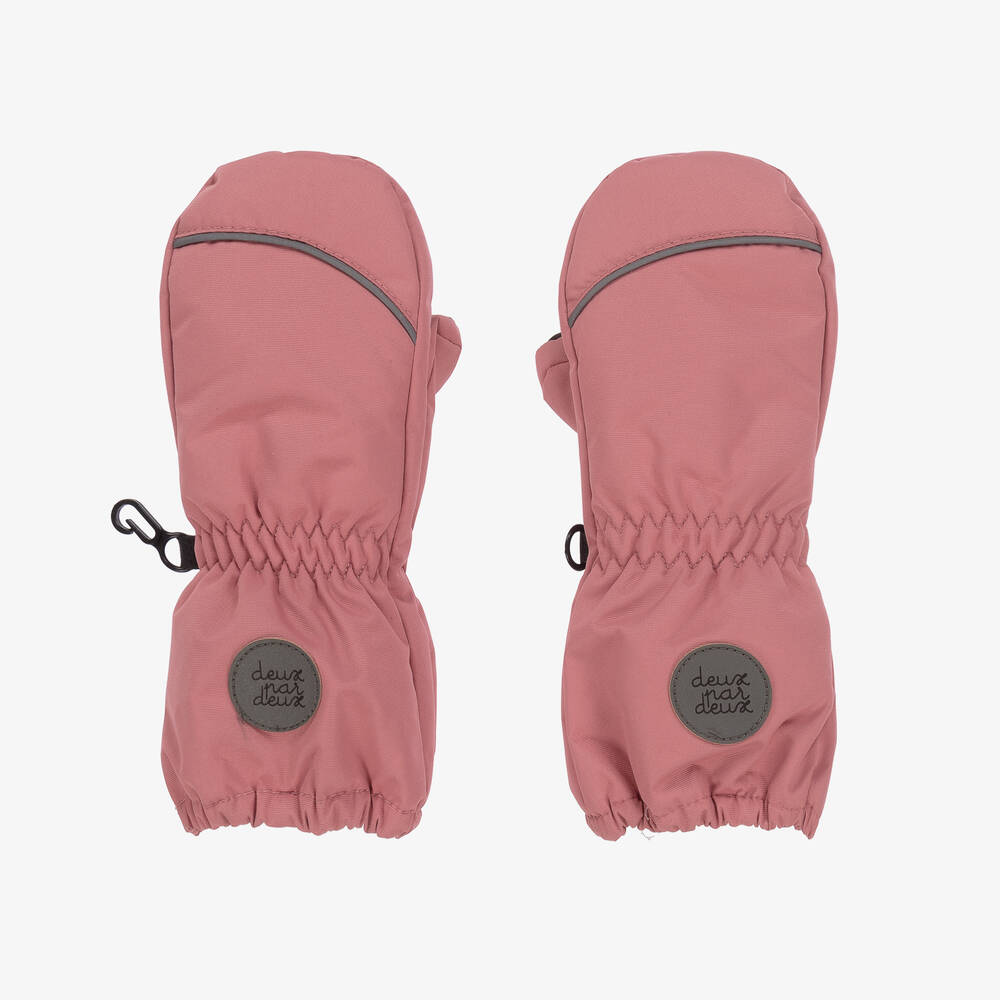 Dusky pink ski mittens for girls by Deux Par Deux, with a water repellent coating. Lined in soft and cosy fleece, they have long, elasticated cuffs to keep warmth in and snow out, reflective trims for improved visibility and reinforced, slip-resistant palms for extra grip. To prevent them from getting lost, there is a useful clip fastening to attach them together.