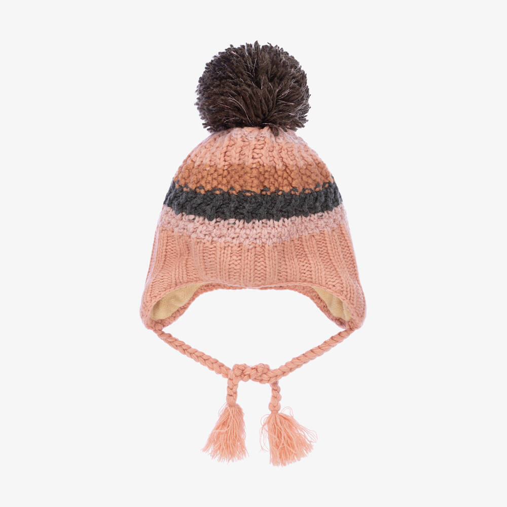 Dusky pink and grey knitted hat for girls, by Deux Par Deux. Lined in soft and cosy polar fleece, it has a logo charm on the turned-up brim and striped details with shimmery details. Featuring a dark grey and pink sparkly pom-pom on the top, it has ear flaps with braided tassels on the sides that tie under the chin for extra warmth.