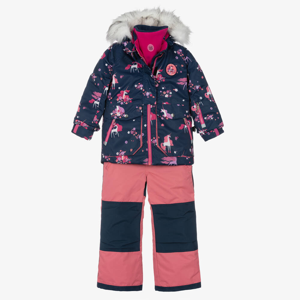 Girls pink and navy blue two-piece snowsuit by Deux Par Deux, including a cosy fleece neck warmer. Breathable and waterproof, the TEFLON-coated fabric is insulated to withstand temperatures as low as -30°C, and has reflective details. Printed with a fun unicorn design, the fleece-lined jacket has a front zip fastening with velcro storm placket, an internal snow skirt, and a removable hood with white faux fur trim. Internal carry straps allow the jacket to be transported like a backpack, and there are multiple zipped pockets including a ski pass pocket on the sleeve. The salopettes have reinforced panels at the seat and knees, adjustable and detachable braces, and internal gaiters. Designed to grow with your child, the sleeves and legs can be adjusted to different lengths for lasting wear.