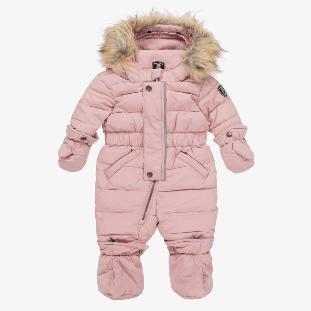 Pink snowsuit set for little girls from Deux Par Deux, made in a smooth Teflon EcoElite coated fabric, making it both water-repellent and quick-drying. Warmly padded, it is lined in a soft fleece, has ribbed cuffs and a fixed hood with a detachable faux fur trim. It has useful fleece-lined pockets on the front and detachable mittens and booties, with stretchy, adjustable button fastening stirrups. It fastens with a zip on the front, below a popper fastening storm flap and has an adjustable, elasticated waistband for a snug fit. Light reflective trims and logo patch, help with visibility and safety, with a velcro fastening fleece neck warmer adding extra comfort and warmth.