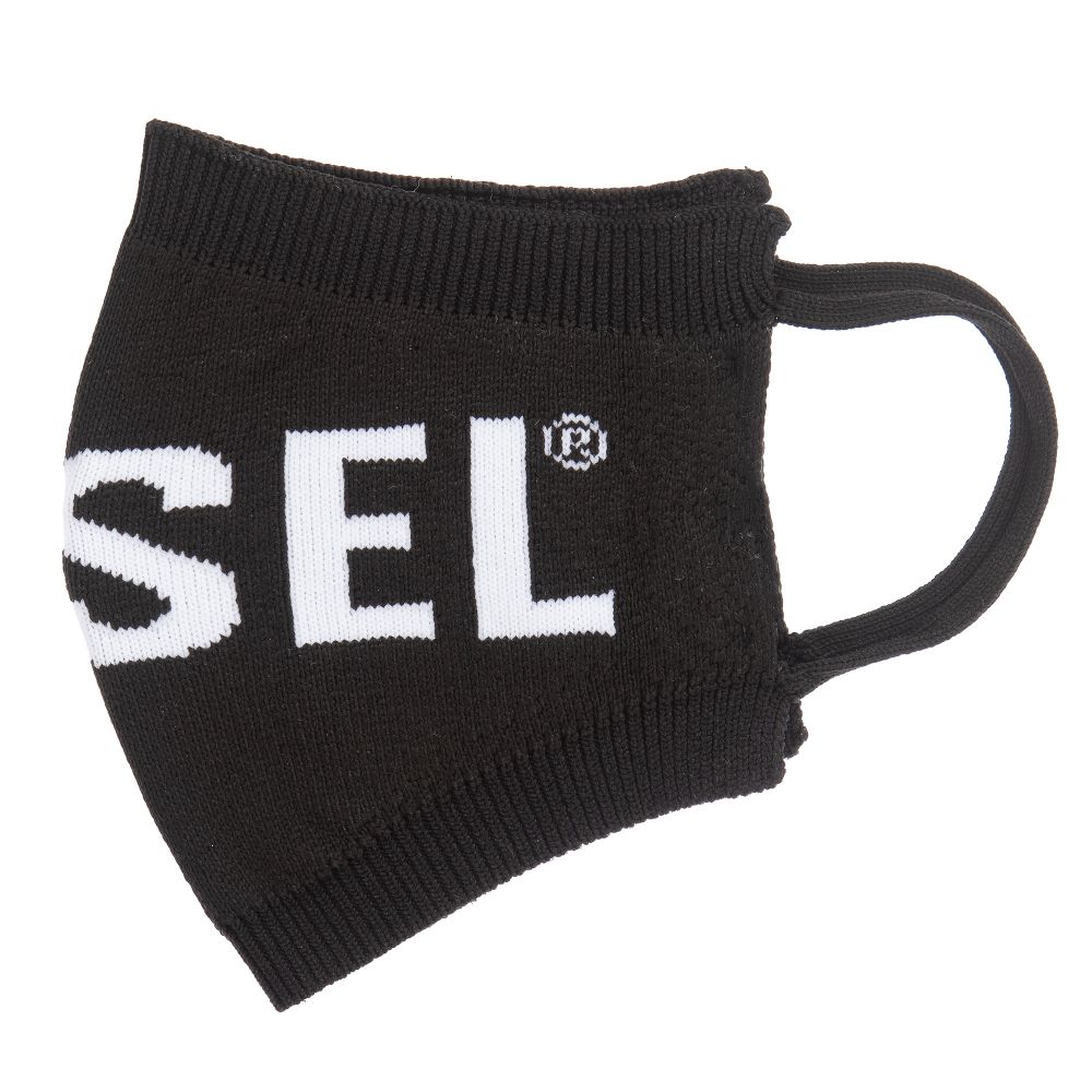Black face covering for boys and girls by Diesel. Made from soft, stretchy and knitted polypropylene jersey, with elasticated straps and the brand's logo in white.