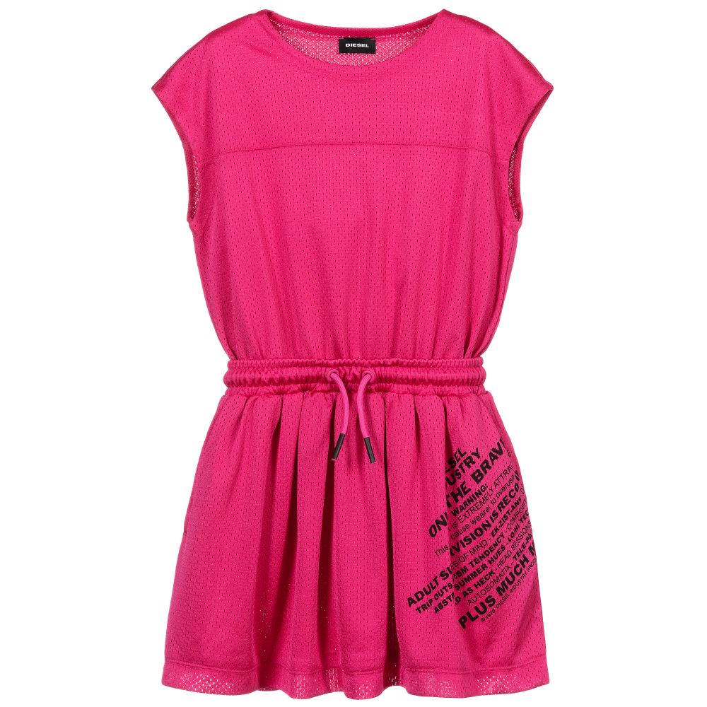 Girls fuchsia pink dress by Diesel, made in airtex fabric with a soft sheen. It has an elasticated waistband with a black tipped drawstring, and a large black logo print on the skirt.