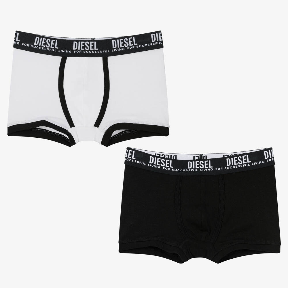 Two pairs of boxer shorts for teen boys by Diesel, in black and white colourways. They are made in soft and stretchy cotton jersey, with an elasticated jacquard logo waistband for comfortable wear.