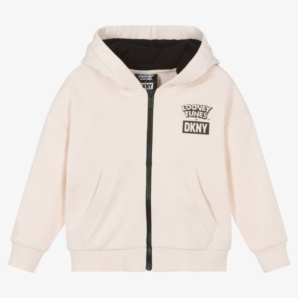 Light beige zip-up hoodie for boys and girls by DKNY, in collaboration with Looney Tunes. Drawing inspiration from the playful cartoon, it has a bold black zip on the front and logo motif printed on the front in black. The back is printed with an oversized Tasmanian Devil character for a graphic look.