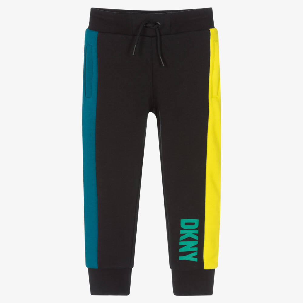Boys black joggers designed by American brand DKNY. These cuffed joggers have lime yellow and teal blue colourblock panels and concealed side pockets. Great for all-day comfort, they are made in soft cotton sweatshirt jersey with an elasticated, drawstring waist. The label's iconic green logo print can be found on one leg.