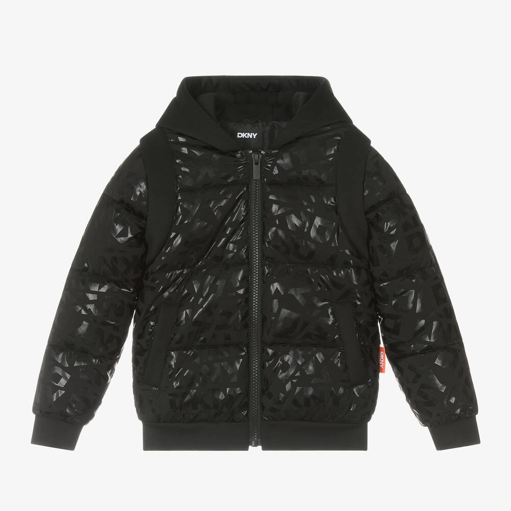 Cool black puffer jacket for boys and girls by American streetwear label DKNY. It is made in smooth fabric with a shiny jacquard logo pattern for a distinctive look. Warmly padded, the jacket has stretchy ribbed trims and a fixed hood for extra cosiness. It fastens with a chunky zip and has slanted front pockets. An orange logo tab on the side seam adds a designer finishing touch.