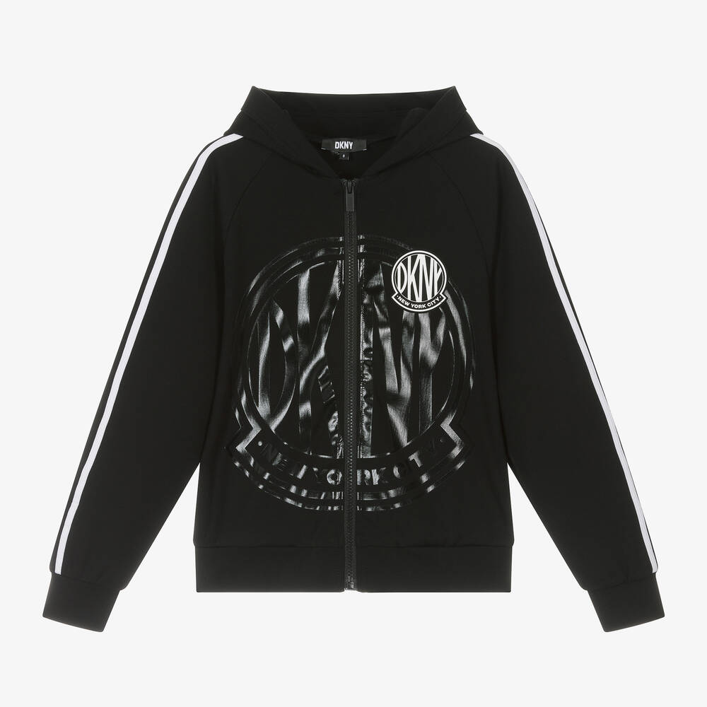 In DKNY's signature black with white trim, this hooded zip-up top is designed for both boys and girls. Made in luxurious Milano jersey, it has a tonal, shiny logo print on the front with a smaller, matching rubberised motif on the chest in white. There are useful side seam pockets and the front zip fastening has a branded pull tab to complete the look.