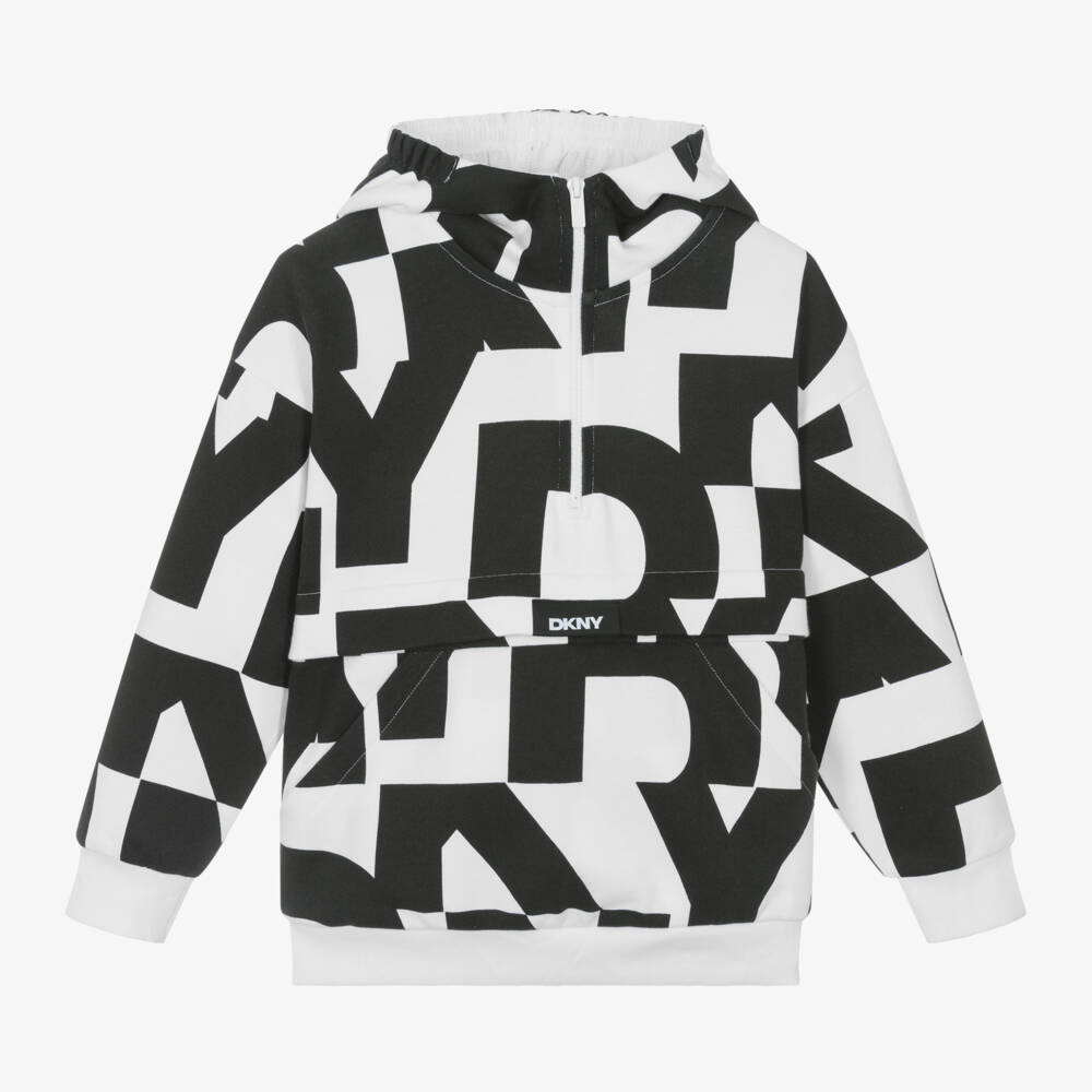 Mini-me black and white hooded zip-up top for boys and girls by DKNY, with an oversized logo graphic design. Both casual and comfortable, it is made in mid-weight cotton jersey with a half zip fastening and pouch pocket on the front. The hood has an elasticated trim and a soft mesh lining adding a sporty touch to the design.
