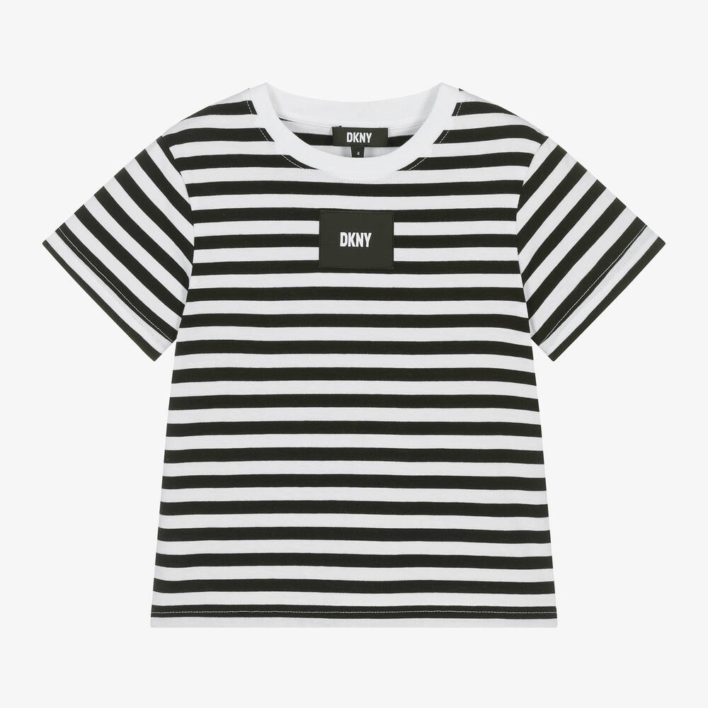 Striped in black and white, an eye-catching T-shirt for boys and girls from American brand DKNY. Made in soft organic cotton jersey, this casual tee has a lightly ribbed crew neck and short sleeves. A silky black and white logo patch on the front adds a distinctive designer touch.