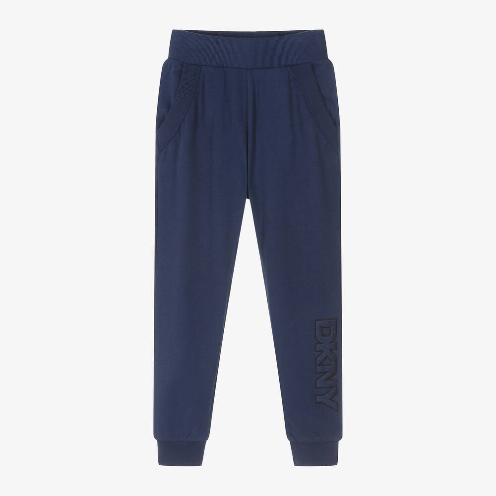 Ink blue cotton joggers for boys and girls by DKNY, made in soft, mid-weight jersey. Comfortable and casual, they have a ribbed, elasticated waistband and ribbed trim on the front pockets. For a distinctive designer finish, embroidered logos can be seen on the front and back.