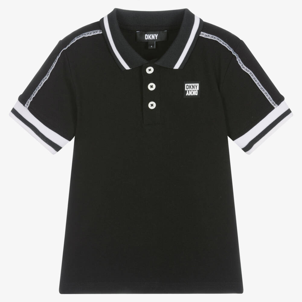 Black cotton polo shirt for boys by American brand DKNY, made in soft, comfortable piqué. It has a black and white rubberised box logo on the front along and white logo trims on the shoulders and sleeves. It fastens with white logo buttons and has ribbed black and white trims.
