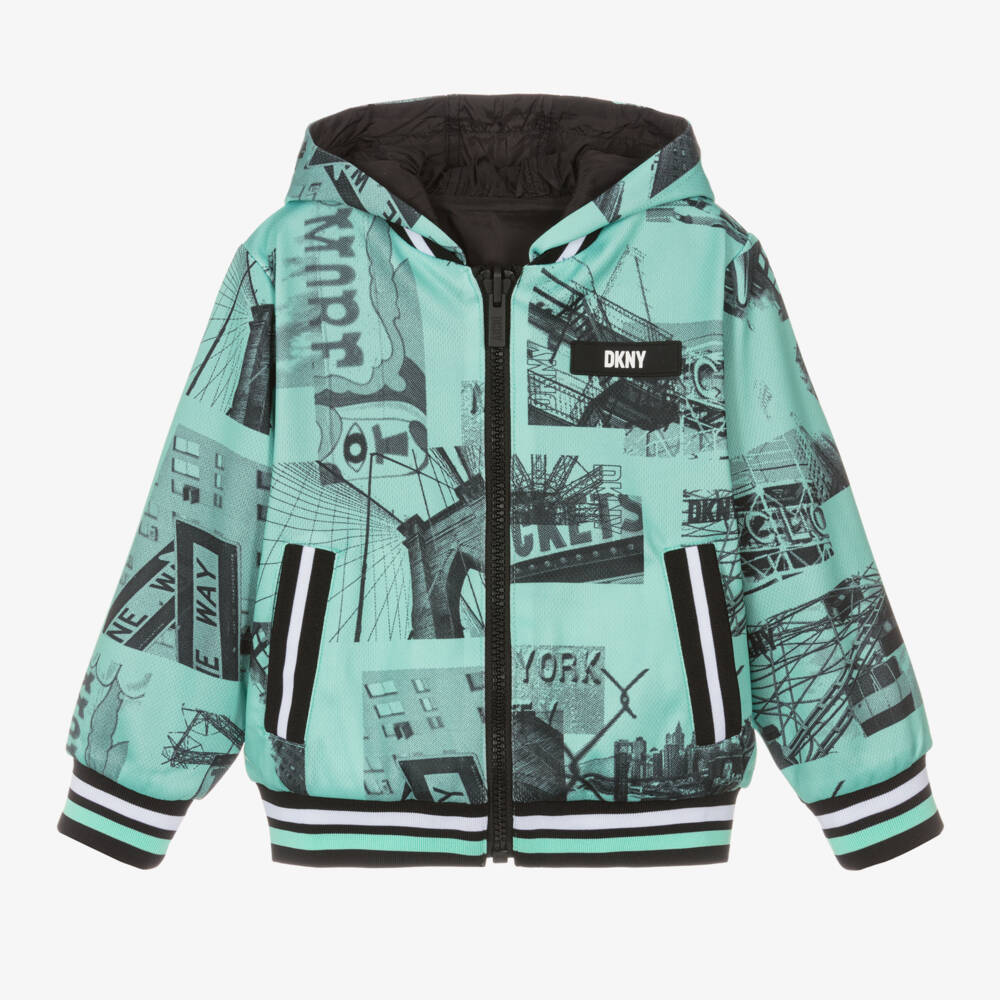 Super cool, this reversible hooded zip-up jacket for boys is by DKNY. Patterned with a black Coney Island graphic print, the green side is made from soft mesh jersey and has a rubberised logo patch on the chest. Smooth and lightweight, the reverse side is plain black with a white printed logo detail. Complete with useful pockets on both sides, the jacket has striped ribbed elasticated trims for a sporty finish.