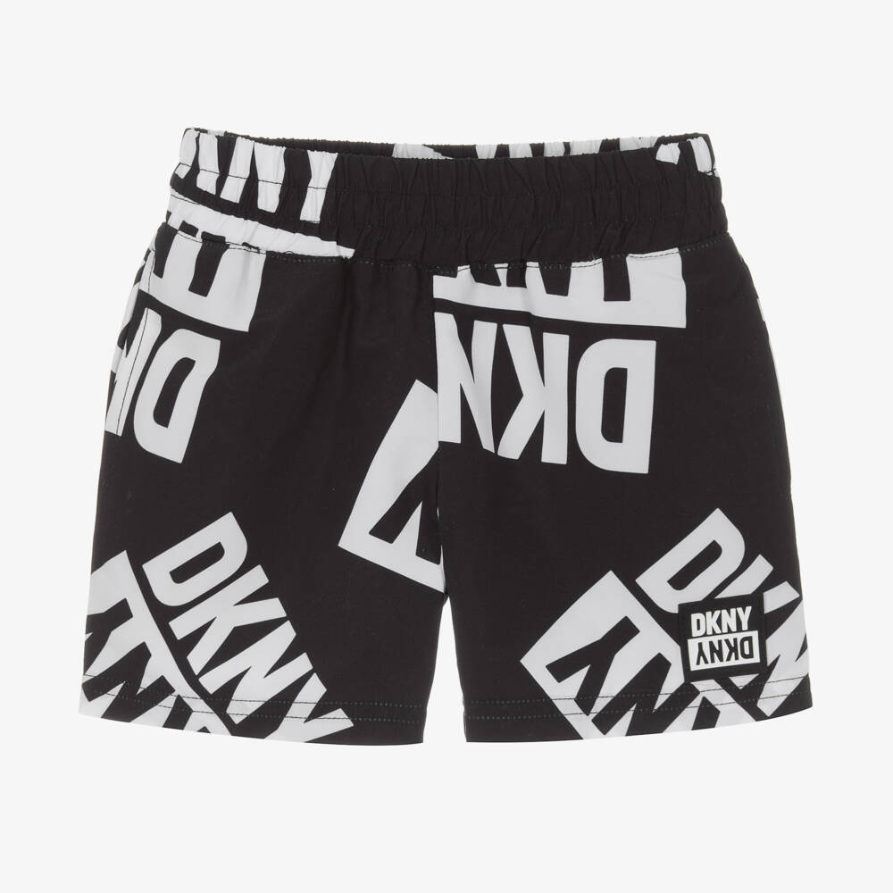 Black swim shorts for boys, unmistakably by American brand DKNY, with an all-over white logo print and a rubberised logo patch on the front. Soft and lightweight, they have a comfortable, elasticated waist, useful concealed side pockets and a mesh lining for comfort.