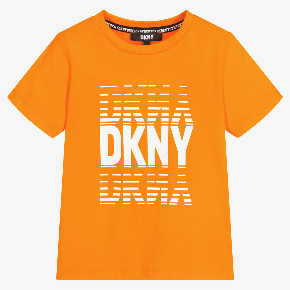 Bright orange T-shirt for boys by DKNY, made in soft cotton jersey It has a bold white logo print on the front in a cool, mirrored style for a instantly recognisable designer look.