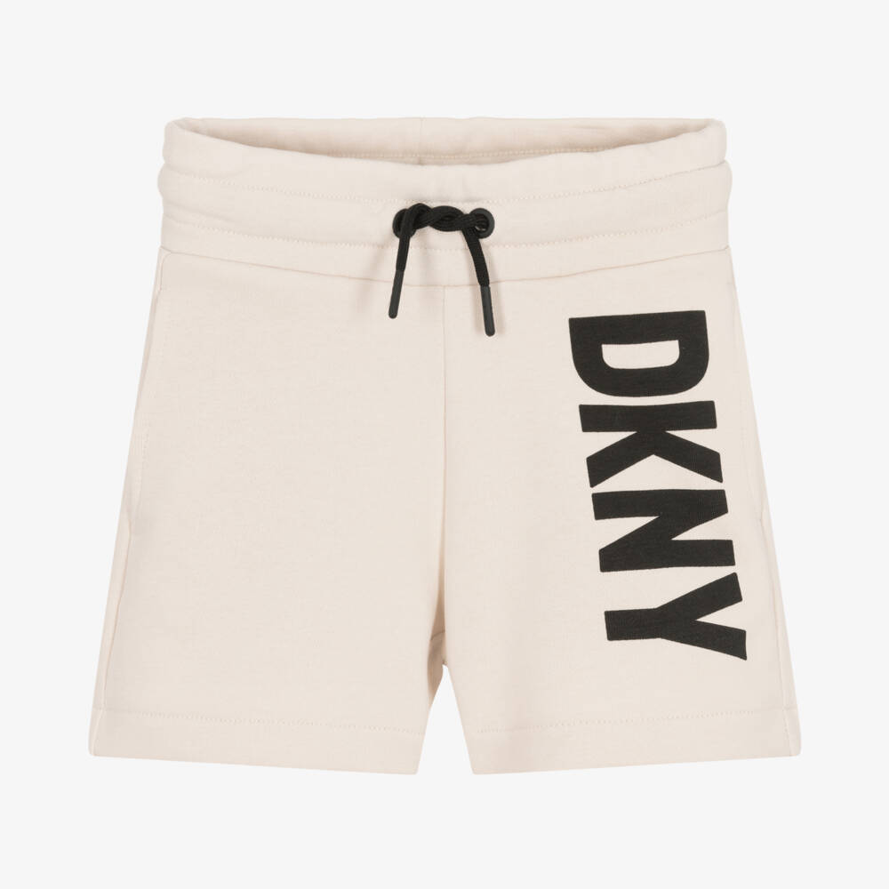 Beige shorts for girls by DKNY, made in comfortable, mid-weight cotton jersey. Making an instant statement, they have a bold black logo print down one leg and concealed side pockets. The waistband is comfortably elasticated and has drawstring ties to adjust the fit.