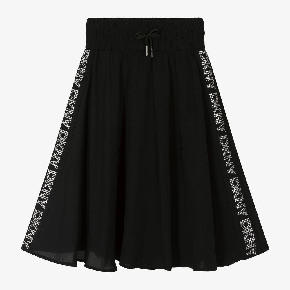 A black skirt for girls by DKNY, made from lightweight chiffon with a smooth viscose lining. Enhancing the sporty style, there are silver studded logo designs down each side and a wide elasticated drawstring waist for a comfortable fit.