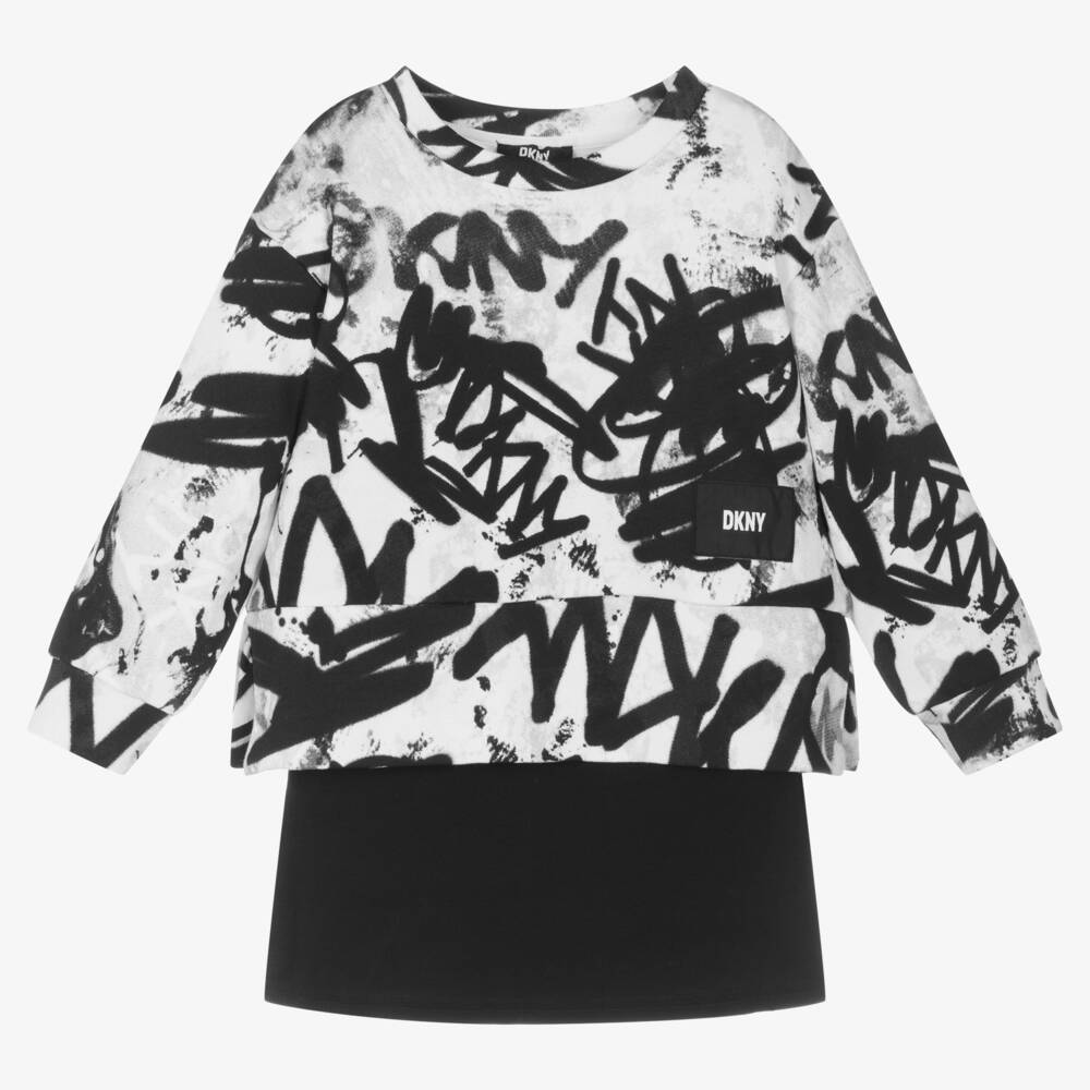 A black and white dress set for girls by DKNY, made from super soft cotton jersey. The A-line dress has a racerback design with stretchy jacquard logo shoulder straps. It pairs with the graffiti-print sweatshirt for a bold modern look, with split hems and logo badges. Each piece can be worn separately for alternative styling options.