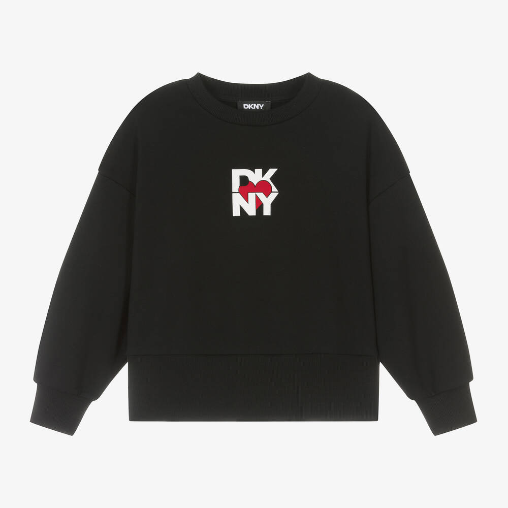 A black cotton sweatshirt for girls by DKNY, part of the brand's Heart of NY capsule collection. Designed in a relaxed fit, this comfortable long-sleeved top has a bold white and red heart logo graphic on the front. Made in mid-weight jersey, it has stretchy ribbed trims and a wide hem to complete the casual, laid-back look.