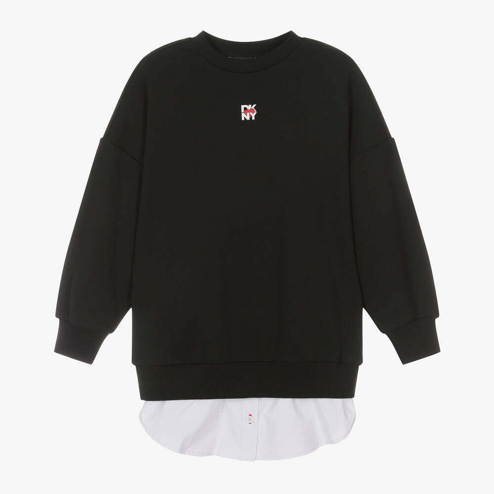 Inspired by the main collection, a black cotton sweatshirt dress for girls by DKNY. Part of the brand's Heart of NY capsule collection, this oversized dress is ideal for cool, laid-back styling. Easy to wear, it is made in comfortable jersey with a white poplin shirt style hem and features a white and red heart logo design on the front for a signature look.